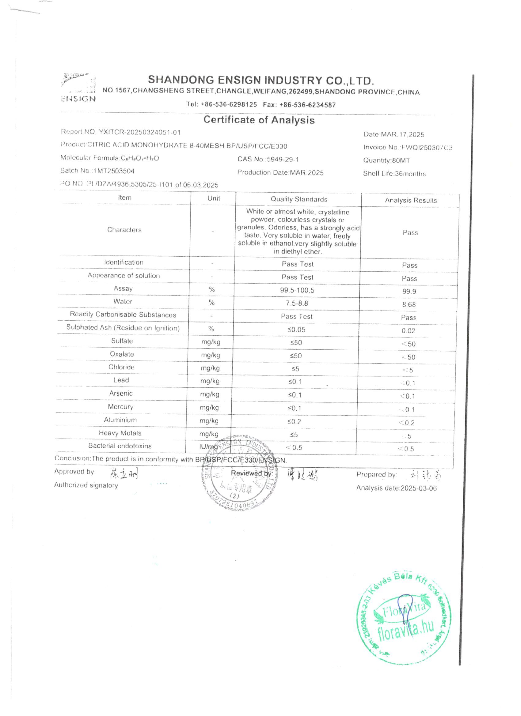 Elemzési tanúsítvány: http://svk.floravita.hu/spec/citromsav-ElemzesiTanusitvanyMagyar.pdf